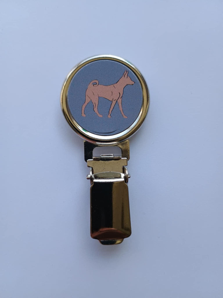 It comes complete with pin to attach to your clothing, and a clip for your ring number.