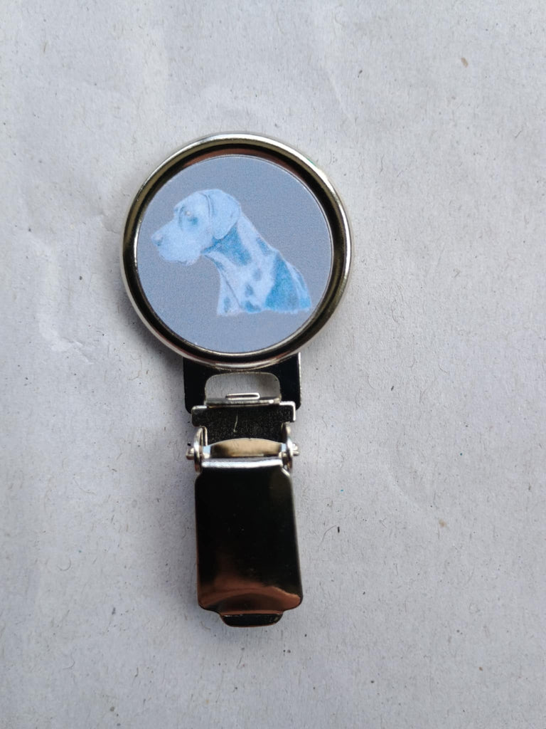 A Blue Great Dane Ring Clip for Dog Shows.