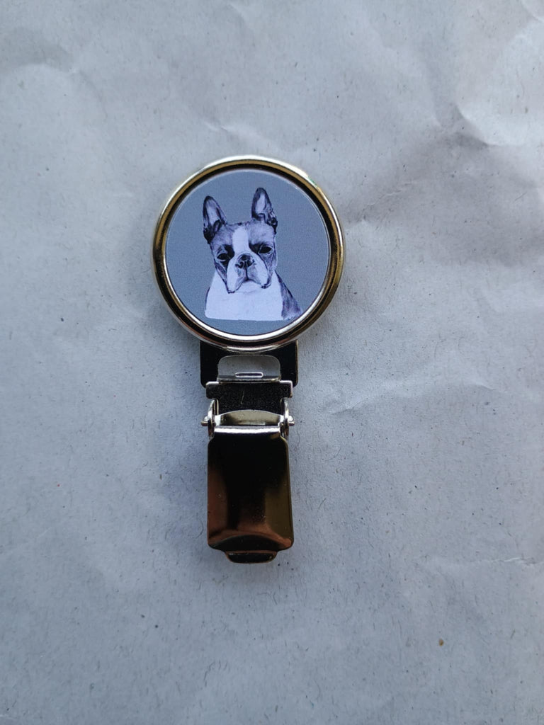 It comes complete with pin to attach to your clothing, and a clip for your ring number.