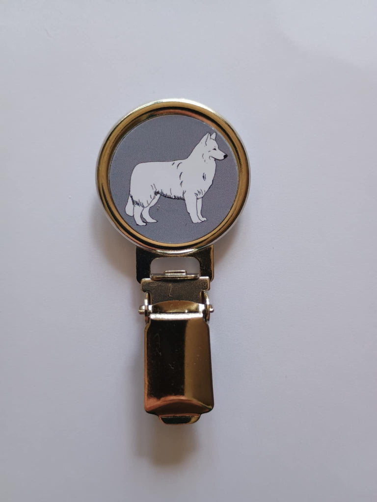 A White Swiss Shepherd Ring Clip for Dog Shows.
